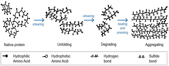 Protein is the most important ingredient in the production of HMMA using extrusion technology. During extrusion, protein is denatured, unfolded, realigned and cross-linked, due to the shear, heat, pressure and cooling (Figure 1) achieved in the extruder and cooling die, respectively [17]. The final texture of HMMA is influenced by different types of protein bonds. Several factors determine the protein interactions such as protein type, pre-treatment and extrusion parameters [17].