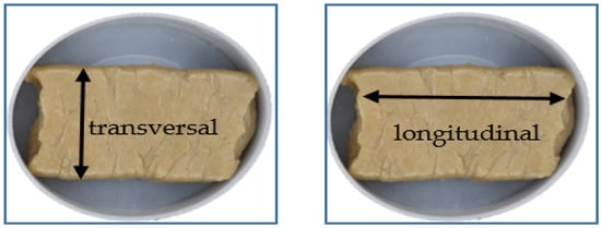 Texture profile analysis (TPA), cutting test, and tensile strength were carried out to evaluate the overall texture of the extruded products. The measurements were performed using a texture analyser (TVT-300XP, Perten Instruments AB, Hägersten, Sweden) [13,22]. For TPA, samples size of 2 × 2 cm with 7 mm thickness were compressed by 2 mm using a cylindrical probe (Ø 18 mm). Hardness, springiness, resilience and chewiness of the samples were determined. Hardness is a measurement of how hard the product is and can be determined by the maximum force of the first compression [23]. Springiness shows how well the product returns to its original structure after the first compression, while resilience describes how well the product regains its original height after the compression [23]. Chewiness shows how much work is needed to chew the product to achieve the texture that is suitable for ingestion [24]. Other parameters such as cutting and tensile strength could be linked to the quality of meat, for instance, describing the tenderness [25]. A minimum of three measurements for each sample was performed. For the cutting test, two types of cutting strength were measured: transversal and longitudinal. Samples of 2 × 2 cm (transversal) and 5 × 2 cm (longitudinal) with 7 mm thickness were cut 5 mm deep using a knife blade (height 117 mm) at a speed of 2 mm/s. Transversal cutting was done in the direction of the width of the sample whereas longitudinal cutting was done in the direction of the length of the sample (Figure 3). For tensile strength, a sample of 2 × 12 cm was prepared. The sample was attached to the rig and stretched 30 mm at a speed of 1 mm/s and the break force (g) was measured.