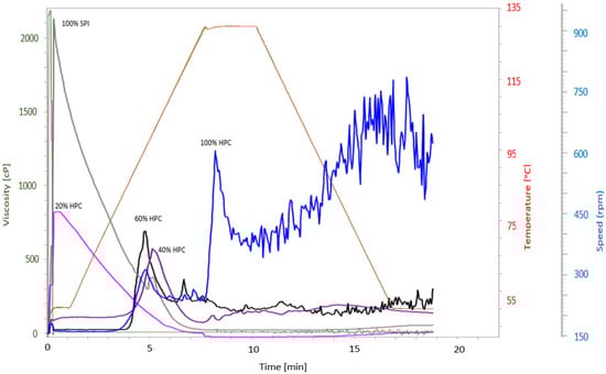 The Rapid Visco Analyzer (RVA) was used to measure several parameters related to the pasting properties of the raw materials used. Obvious differences were found between the samples when it comes to their behaviour during heating and cooling in an excess of water. From Figure 4, the SPI (grey curve) showed the highest peak viscosity among all samples which indicates a good paste texture and high water-binding capacity. This characteristic could provide excellent texture which is desirable in HMMA products [26]. Despite that, HPC alone showed a rather inconsistent behaviour which was also found in the 40% (purple curve) and 60% (black curve) HPC-SPI mixtures. At the end of the analysis, it was observed that the HPC sample formed spheres inside the container which might alter the result. The spheres hinder the paddle in the rotation causing this inconsistence behaviour. According to some researchers, the interaction of starch and fatty acids may also contribute to a new complex, thus affecting some modification and texture stability of the final product as previously reported by others [27,28]. Pasting temperature is the minimum temperature required to cook a sample [28], and it was found to vary from 53.8 °C to 90.8 °C for HPC-SPI mixtures compared to the SPI sample (50.2 °C). This indicates that cold swelling takes place directly for pure SPI and 20% HPC mixture (pink curve). SPI and the 20% HPC mixture required the shortest time to reach maximum viscosity (0.4 min and 0.3 min, respectively). It was noted that for the samples with higher degree of hemp substitution, a longer time was required (8.2 min for 100% HPC). This means that HPC needs more time and higher temperatures to bind water and denature before reaching the maximum viscosity compared to the SPI. The maximum viscosity was reached due to the reduction of protein solubility as a result of denaturation of native proteins [13]. Overall, these results indicate that the substitution of HPC had a readily observable influence on pasting behaviour.