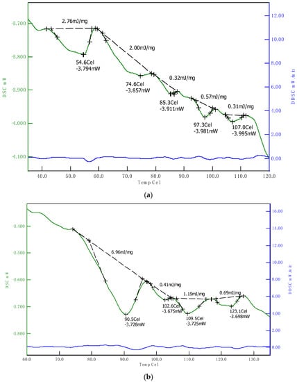 Different melting temperatures were observed for SPI and HPC in the DSC analysis, due to different protein contents. There were one to four endothermic peaks identified in HPC, whereas three to five endothermic peaks were observed in the SPI. The proteins in the HPC had overall higher melting temperatures (90.3–123.1 °C) as compared with SPI (54.6–107.0 °C) (Figure 5). This indicates that the cooking zone in the extruder with the highest temperature should be set to at least 123.1 °C if all proteins in the HPC should denature during extrusion. One main peak was detected in HPC which probably corresponds to Edestin, a storage protein in the hemp seed. It was found in all samples with high enthalpies (5.53–7.25 mJ/mg) [16,19]. For SPI, peaks for 7 S and 11 S globulins were identified, but with relatively lower enthalpies (0.17–2.00 and 0.57–0.90 mJ/mg, respectively) [29].