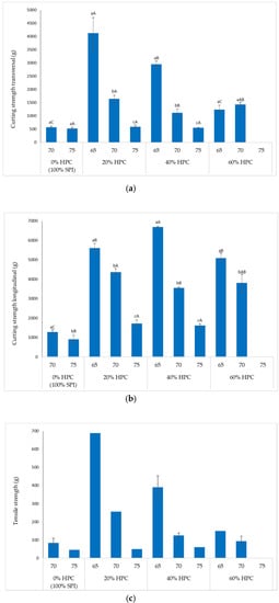 (a) Transversal cutting strength; (b) longitudinal cutting strength; (c) tensile strength of different HMMA formulations at each target moisture contents. Bars represent the mean ± standard deviation of triplicate measurements. Different lowercase letters indicate significant differences (Tukey’s test, p < 0.05) within the same HMMA formulation. Different uppercase letters indicate a significant difference between different HMMA formulations. Bars without standard deviation represent only one measurement.