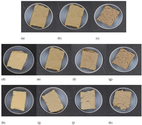 Images of extruded meat analogues with different formulations: (a–c) 20%, 40%, 60% HPC at 65% target moisture; (d–g) 0%, 20%, 40%, 60% HPC at 70% target moisture; (h–k) 0%, 20%, 40%, 60% HPC at 75% target moisture.