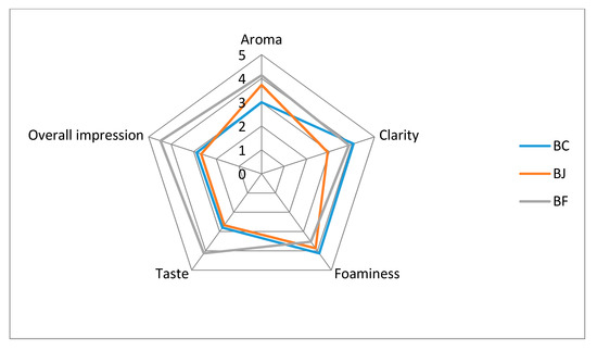 The aroma, colour, clarity, foaminess and overall impression of beer were assessed. The beer that achieved the highest rating in terms of aroma, taste, clarity and overall impression was BF (Table 4, Figure 1). This is in line with the results of research carried out by Adamenko et al. [36] on beers with the addition of Cornelian cherry, where beers with the addition of fruit also received better marks in terms of taste than control beers. Statistical analysis showed no significant differences between BC and BF clarity, although the addition of juice negatively affected this attribute. The use of whole fruit caused a significant deterioration in beer foaminess. Control beer got the highest grade for foaminess; however, statistical analysis did not show a significant difference between the BC and BJ results. The addition of juice does not worsen the beer foam quality. It is possible that a high concentration of polyphenols in beer can have a detrimental effect on beer foaming [2]. Although some authors show a positive effect of high polyphenols on beer foam stability [56]. The results obtained are contradictory. It has not been clearly defined how polyphenolic compounds affect beer foam. BF achieved the best note for taste criterion. In this aspect of sensory analysis, it obtained significantly higher results than other analysed beers. BJ and BF beers received better aroma ratings than BC. This may be due to a higher concentration of esters characterised by floral and fruity notes (ethyl hexanoate or ethyl octanoate). Zapata et al. [38] presented similar results. They analysed the composition of the quince beer aroma. The study showed that the higher concentration of ethyl esters resulted in better scores in sensory analysis.