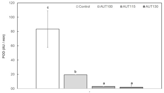 Peroxidase activity (POD) of wheat bran (WB) Control, AUT100, AUT115 and AUT130. POD values are expressed as AU/min. Values with different small letters show significant differences (p < 0.05) between autoclave treatments.