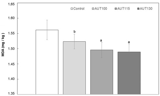 Malondialdehyde (MDA) of WB Control, AUT100, AUT115 and AUT130. MDA values are expressed as mg/kg of WB. Values with different small letters show significant differences (p < 0.05) between autoclave treatments.