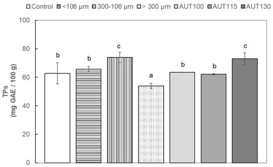 Total phenols (TPs) of WB Control, AUT100, AUT115, AUT130 and WB autoclaved at 130 °C with different particle size, >300, 300–106, and <106 µm. TP values are expressed as mg GAE/100 g. Values with different small letters show significant differences (p < 0.05) between treatments.