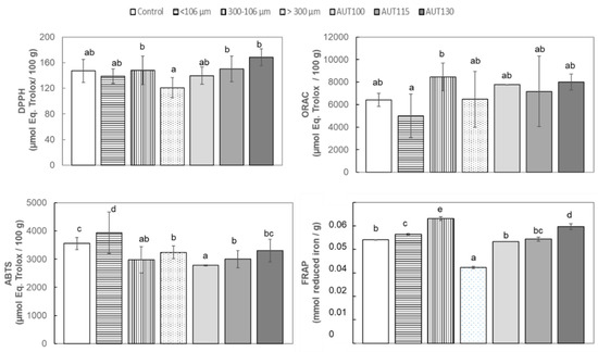 DPPH, ORAC, ABTS and FRAP of WB Control, AUT100, AUT115, AUT130 and WB autoclaved at 130 °C with different particle size, >300, 300–106, and <106 µm. Values are expressed as: µmol Eq. Trolox/100 g for ORAC, DPPH, ABTS, and mmol Fe2+/g for FRAP. Values with different small letters show significant differences (p < 0.05) between treatments.