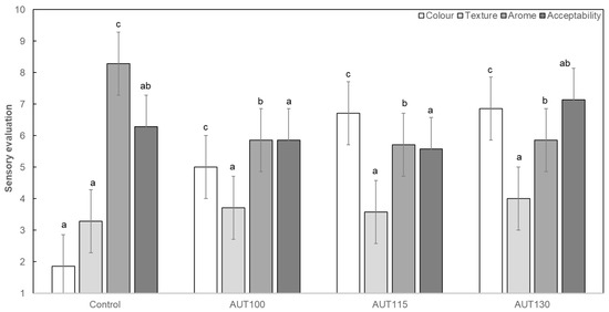 Sensory evaluation of WB Control, AUT100, AUT115 and AUT130. Values with different small letters show significant differences between autoclave treatments (p < 0.05).