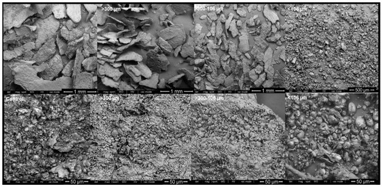 SEM images of WB Control, AUT100, AUT115, AUT130 and WB autoclaved at 130 °C with different particle size, >300, 300–106, and <106 µm.
