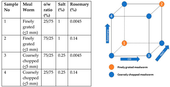 Illustration of the experimental design. To the left an overview of the design and to the right an illustration of the design oil content ~12.5% or ~37.5%, NaCl content ~0.25% or ~1%, and rosemary content ~0.0045% or ~0.14%.