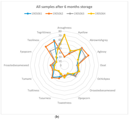 Spider diagram of sensory attributes of (a) fresh samples and (b) after 6 months of storage.