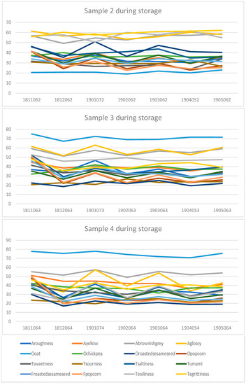 During storage there was, however, a significant decrease in some of the volatile odour compounds. The sensory panel clearly detected a drop in the odours and flavours of popcorn, oat and roasted sesame seed. This was supported by the regression analysis, which showed that storage time had a significant influence on these sensory attributes. The decrease could probably be related to changes in the chemical composition of volatiles during storage [34].