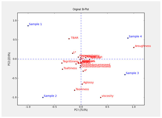 Figure 4 shows a PCA plot of the mean values over time for the four samples, showing 97.6% of the variance in the resulting data. The four samples are well distributed in each of the four quadrants. Along the first principal component, showing 75.0% of the variance, samples 3 and 4 (coarsely chopped mealworm and low salt content) are plotted close to roughness and opposite samples 1 and 2 (finely grated mealworm and high salt content). The second principal component, representing 22.6% of the variance, was TBAR, with samples 1 and 4 (with low oil content) showing opposite glossy appearance, oiliness and viscosity, which are instead close to samples 2 and 3 (with high oil content). Overall, the results show that the design had a clear impact on the measured parameters.