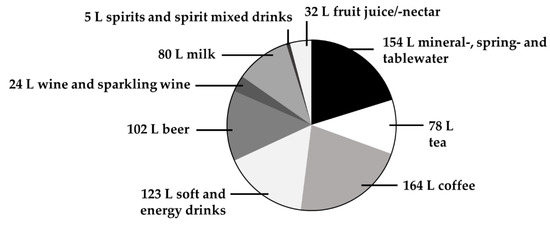 The average annual beverage intake of the German population in 2018 was estimated to be approximately 760 litres [1]. In terms of consumption, coffee is the most important beverage, followed by mineral water, soft drinks, beer, tea and wine, as summarized in Figure 1. Beverages are the major source of water intake [2] but may also significantly contribute to the supply of minerals and trace elements [3,4].