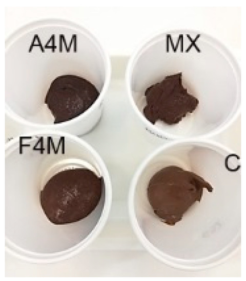 The visual appearance of the cocoa spreads with milk fat/cellulose ether emulsions is presented in Figure 1. The three spreads presented a spreadable texture like the commercial control cream. The MX spread was the least similar to the control, presenting a lumpy and aerated texture, similar to that of a mousse.