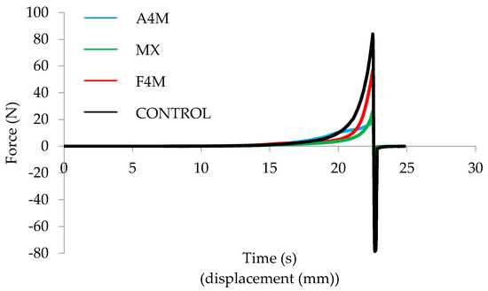 To better appreciate the significant differences between the samples, Table 1 shows the values of maximum force and AUC calculated from the curves data. The maximum force and AUC were significantly higher in the control cream, while F4M spread shows significantly higher force values than the MX and A4M spreads. MX cream was the one with the lowest peak force and AUC.