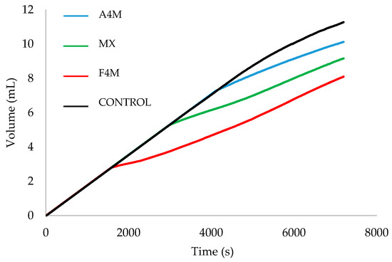 After 30 min of intestinal incubation differences were observed between the samples, with a decrease of the curves’ gradients for the cellulose ether spreads. The F4M spread had the lowest NaOH consumption when the trial ended, followed by the MX and A4M spreads. This lower NaOH consumption indicates a lower digestibility in the emulsion-based spreads than the control spread. Therefore, cellulose ethers reduce the effectiveness of bile salts and digestive enzymes in fat digestion.