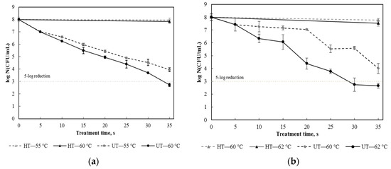 Freshly squeezed pulp free apple juice inoculated with E. coli and S. aureus, respectively, was ultrasonically processed at different temperatures (55 and 60 °C for E. coli, and 60 and 62 °C for S. aureus) and thermally treated at the same temperatures. The resulting survival curves are shown in Figure 2. In screening tests, ultrasonic processing was performed at temperatures below 50 °C for E. coli and below 60 °C for S. aureus. At those temperatures, the inactivation effect of ultrasound was not enough to achieve a 5-log microbial reduction in one minute. Figure 2a shows that sonication at 60 °C quickly reduced the cell density of E. coli by 5 logs in 35 s while the nonthermal nature of the process was still maintained because the sole heat treatment at the temperature led to a microbial reduction less than 0.3 log; however, an ultrasound treatment at 55 °C for 35 s resulted in a 4-log reduction. The strengthening effect of temperature on ultrasonic inactivation of E. coli was also found in other studies [30,31]. Figure 2b shows that the survival of S. aureus under ultrasonic processing exhibited a similar trend, but a higher processing temperature was needed because S. aureus cells have a cocci shape and a Gram-positive cell wall structure, making them more resistant to the lethal effect of ultrasound [21,32]. Figure 2b also shows that the inactivation rate was very slow in the first 20 s of the ultrasound treatment at 60 °C. However, as the temperature increased to 62 °C, the inactivation rate significantly increased, and a 5-log reduction was achieved in 29 s. Based on these results, suitable ultrasonic processing conditions for E. coli and S. aureus were obtained and given in Table 1.