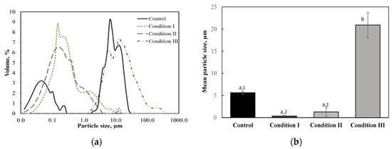 The size distribution and volume mean diameters of pulp particles in apple juice processed under different conditions are presented in Figure 3. As shown in the figure, untreated apple juice exhibited a bimodal particle size distribution, one curve ranging from 0.013 to 0.243 µm with a peak at 0.05 µm, and the other ranging from 0.194 to 26.16 µm with a peak at 6.5 µm. The volume mean diameter of pulp particles in untreated apple juice was 5.6 µm. As shown in Figure 3a, the particle size distribution shifted toward smaller values with a peak at 0.14 µm and 0.17 µm for apple juice processed under condition I and condition II, respectively, whereas it shifted toward a larger value for the thermally processed juice under condition III. Accordingly, Figure 3b illustrates the volume mean diameters for juice processed under conditions I and II decreased, whereas that for the juice processed under condition III increased. This indicated ultrasonic waves broke down pulp particles, while heat treatment caused their aggregation. These results were in good agreement with previous findings [14,23,39].