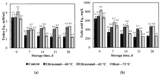 Changes in the DPPH radical scavenging activity (a) and total phenolic content (b) in apple juice treated under different conditions during storage at 4 °C. On the same day of storage, for juice treated under different conditions, values with different superscript letters are significantly different (p < 0.05). Under a treatment condition, for juice with different storage times, values with different superscript numbers are significantly different (p < 0.05).