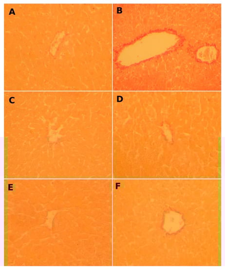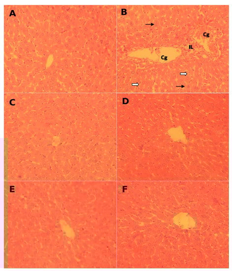 Pathological histology analysis in rat liver tissues after HE staining (magnification: 200×): (A) controls, (B) CCl4-treated (CCl4); (C) FLE-treated (FLE), and (D) CCl4-treated co-treated with FLE (CCl4 + FLE). (E) DLE-treated (DLE), and (F) CCl4-treated cotreated with DLE (CCl4 + DLE). Each microphotograph shows a section of an individual liver. Extensive focal necrosis (