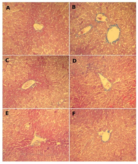 Microscopic observations of the hepatic tissues of control group (Figure 2A) and those of groups pretreated with FLE and DLE (Figure 2 and Figure 3C,E) show a normal distribution of collagen fibers between the portal spaces and the centrilobular vein manifested by a low red and blue color. After treatment with CCl4 (Figure 2 and Figure 3B), fibrous collagen bridges (shown by the intense red and blue stains) were formed between portal spaces and the centrilobular, marking hepatic fibrosis.