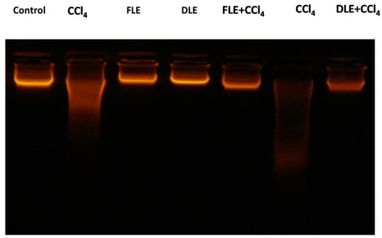As shown in Figure 4, the DNA extracted from the hepatic sections has changed qualitatively. The control group DNA (lane 1) and that of FLE or DLE-treated groups (lanes 3 and 4) showed an intact band. However, we observed that DNA degraded after treatment with the CCl4 (lane 2 and lane 6), marked by an obvious smearing and laddering which indicates apoptosis. In the FLE + CCl4 and DLE+ CCl4 rats (lane 5 and lane 7), the olive leaf extract addition shows its effect on preventing DNA damage and provides results close to those of the control rats, as observed in Figure 4.
