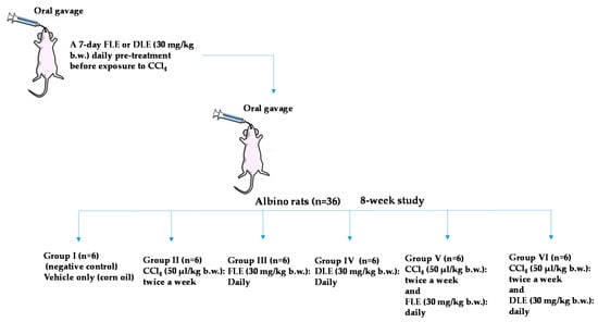 The CCl4 was administered by gastric gavage twice per week (on every Tuesday and Thursday) over eight weeks. A daily pretreatment with FLE or DLE was realized 7 days before CCl4 exposure and then daily throughout the research work by gastric gavage. The rats were sacrificed at the end of eight weeks and 24 h after the last dose of the hepatotoxin.