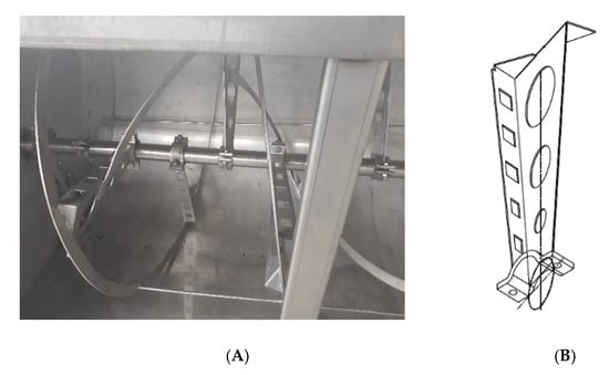 The common reel (unmodified) consists of an external screw whose profile is as long as the entire tank and is welded to the ends of radial elements that start from the shaft and are suitably inclined (Figure 1). It is quite different from that used in the prototype studied by Ayr et al. 2015 [] as some transversal elements were added to the reel: the blades were not bidimensional, but they had a little lateral flag to increase mixing effects and more holes to reduce energy consumption. In the study carried out by Ayr et al. [], a new blade order was added to the reel. As highlighted in the Ayr et al. study, despite good performance of the machine, the effects were still not completely satisfactory. The proposed idea was to increase the mixing action of the malaxer machine by changing differently the blades of the reel. The new modified reel was designed to be even more efficient, thanks to the addition of rectangular elements mounted transversely to about half of the radial elements and suitably inclined (Figure 2). Then, a radial element for each blade was welded. The radial element had a surface of 327 mm length and 79 mm height, and a side strap for solid connection with the blade. All the mechanical parts were made using stainless steel AISI 316L. This extension was intended to improve the kneading of the olive paste, as verified in this paper. The new prototype was tested in an industrial-scale olive oil mill. This machine was new as there was no other industrial malaxer with the same or better characteristics. This represented a new, full-scale prototype and in the next phase, it will be engineered to realize a new, full-scale industrial machine.