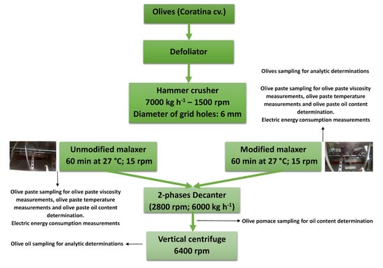 The experimental tests were carried out in an industrial oil mill (Oleificio Schinosa) located in Trani (Puglia, Italy). The plant is equipped with a hammer crusher (model A60; Amenduni Nicola Spa) and two mixing groups (mixing group model Italia; Amenduni Nicola Spa), each consisting of three horizontal tanks (malaxer) of 1000 kg each. The mixing unit consists of a longitudinal steel shaft connected to a 5.5 kW electric motor with a gearbox suitable for obtaining a shaft rotation speed of 15 rpm and equipped with a malaxer reel. The system is completed by a decanter (model REX 250; Amenduni Nicola Spa) of 3000–8000 kg h−1 as the theoretical mass flow rate. The oil is cleaned with a vertical centrifuge (separator A-3500; Amenduni Nicola Spa).