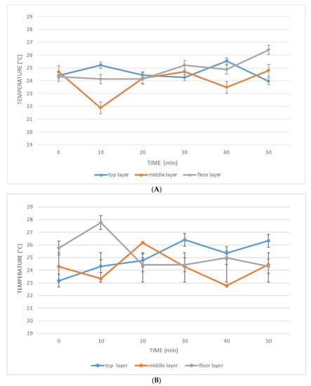 Distribution over time of the temperature inside the (A) unmodified malaxer and (B) modified malaxer.