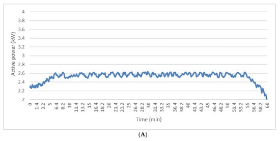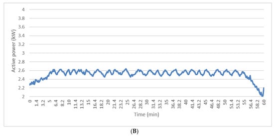 Active electric power absorbed from malaxers as a function of time during the experimental tests. (A) Unmodified malaxer and (B) modified malaxer.