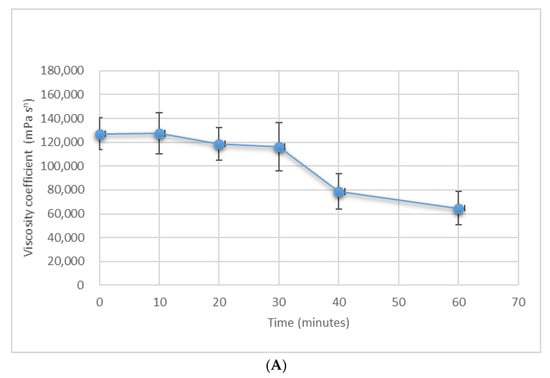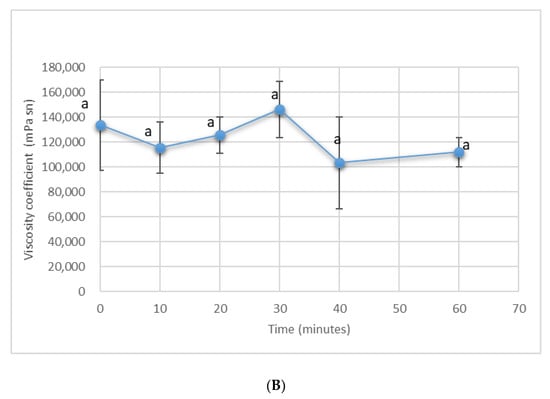 Paste average coefficient of viscosity versus time in the (A) unmodified malaxer and (B) modified malaxer. Data with the same letter do not significantly differ from each other, p ≤ 0.05.