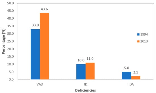 Vitamin A deficiency (VAD), iron deficiency (ID) and iron deficiency anaemia (IDA) in South Africa for 1994 and 2013, for children under five [,].