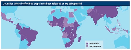 From 2004 to 2017, the HarvestPlus programme, in conjunction with the Consultative Group on International Agricultural Research (CGIAR), increased the release of biofortified varieties of food crops every year, as shown in Figure 2 []. Furthermore, by the year 2018, HarvestPlus, working in collaboration with partners, was undertaking additional testing of crop biofortification in 30 countries where biofortification had not yet been released []. The CGIAR argues that these activities will lead to the additional release of 12 staple crop varieties, meeting farmers’ demands for increased quality, yield and climate resilience in these counties [].