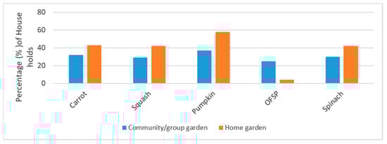 To confirm that households have access to OFSP planting material, a community-based sweet potato nursery was established in one of the South African rural areas in 2003 []. In the rural Western Cape province, OFSP production was scaled up, which improved community participation in the programme []. In rural South Africa, people accessed provitamin A carotenoid-rich foods from either the community or home garden []. However, the supply of OFSP to the households was the lowest, as shown in Figure 3 [].