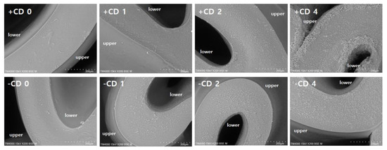 SEM images of transverse sections of yuba films with thicknesses of ~200 µm are shown in Figure 2. The film without CD showed a smooth surface and uniform matrix in the transverse section. With the addition of CD, granular structures appeared to have dispersed throughout the matrices, indicating the presence of specific complexes in the yuba films. In the −CD group, increases in complexes were not observed as the concentrations of CD increased due to the removal of the excessive flavor-entrapped CD. In the samples below 2% concentration, the CD complexes were incorporated from beneath films (the lower surface), while the upper surface of film formation showed a smooth characteristic. In the +CD group, 4% CD addition caused complexes to accumulate on both the upper and lower surfaces. The accumulation of CD on the surfaces of the yuba film decreased the surface glossiness due to the formation of prominent complexes. It is likely that the presence of excessive CD complexes could have decreased the protein interactions within the films, in turn influencing its texture.