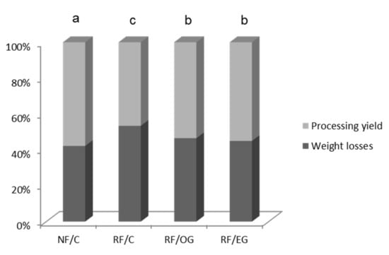 At the end of the ripening process, the losses that products suffered were calculated to evaluate the yield for the various products as a consequence of the reformulation strategy (Figure 1). Samples with all-animal fat had the highest weight losses, 53.4% (RF/C), and the lowest, 42.2% (NF/C). Several authors [28,35,36] have observed higher losses in reduced-fat fermented sausages than in sausages with normal fat. In the present study, the strategy of reducing fat and improving the lipid profile by using oleogel (OG) and emulsion gel (EG) led to products with better binding properties than when only the fat content was reduced (RF/C) (Figure 1). No differences were observed between samples with OG or EG despite the higher quantity of water added directly during the preparation of RF/OG than in the case of RF/EG, in which water was stabilized or entrapped in an emulsion (Table 1).