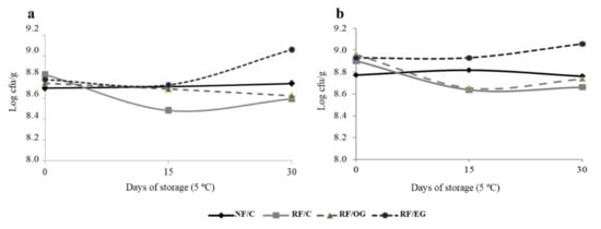 Microbiological factors during chilled storage are known to affect the stability and shelf life of meat products. Figure 2 shows changes in total viable count (TVC) and lactic acid bacteria (LAB). All samples presented high initial microbial counts (>8 log cfu/g) of TVC and LAB, which in general were maintained during chilled storage. However, fuet formulated with emulsion gel (RF/EG) experienced a significant increase in TVC and LAB counts after 30 days in refrigeration, reaching levels close to log 9 cfu/g (Figure 2). These results are in accordance with others observed in dry fermented sausages in which various animal-fat levels were replaced [35,48].