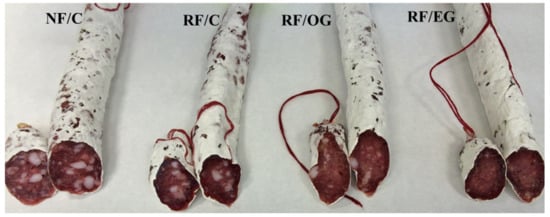 The external appearance of the fuets was similar regardless of the formulation strategy used (Figure 3). However, some differences were observed in their cross-sectional appearance, depending on the lipid source that was used. Thus, while the animal fat was perfectly differentiated in the meat matrix, the oleogel or EG in R/OG and R/EG, respectively, could not be seen (Figure 3).