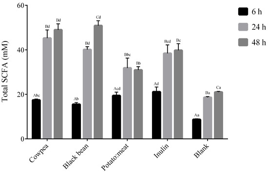 The total production of SCFAs (acetate, propionate and butyrate) along the fermentation time is presented in Figure 1. The concentration (expressed in mM) of total SCFAs increased significantly during fermentation time for all samples. As expected, the negative control (or blank) presented the lowest values of SCFAs. At 6 h of fermentation, potato: beef and inulin displayed a significant increase of analyzed fatty acids when compared to both legumes. At 24 and 48 h of fermentation, a switch in the positions, cowpea and black bean showing the highest values of SCFAs (approximately 50 mM) (p < 0.05). No significant differences were observed between the legumes.