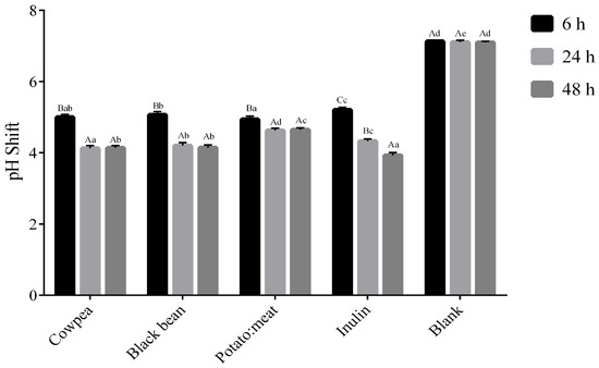 pH shift during fermentation time (6, 24 and 48 h). Results presented as mean and standard deviation (n = 3). The data marked by the same letters were not significantly different (p > 0.05). Different uppercase letters for comparison within each fermentable source at a different time and lowercase letters for comparison within the different fermentable source at the same time, indicating significant differences at p < 0.05.