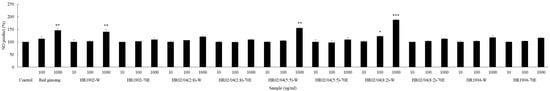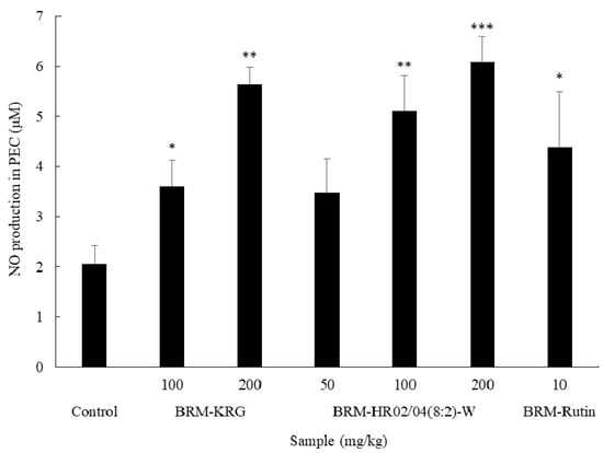 The results of measuring the NO production in PEC are shown in Figure 5. The HR02/04(8:2)-W treated groups produced significantly higher amounts of NO than the control group (p < 0.05). Furthermore, at a concentration of 100 mg/kg, the KRG treated group showed NO production of 3.6 μM and the HR02/04(8:2)-W treated group showed 5.12 μM, which increased by 42% or more than the KRG treated group. As a result of the experiment, it was confirmed that HR02/04(8:2)-W is a material that can effectively increase the immune response while increasing the amount of NO produced, similar to the result of measuring NO production in RAW264.7 cells.