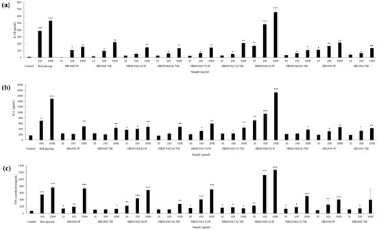 Cells were plated in a 48-well plate at a density of 5 × 104 cells/mL and incubated for 24 h. Further, each sample was treated for 48 h at a concentration of 10 μg/mL, 100 μg/mL, and 1000 μg/mL. Subsequently, 100 μL of supernatant was transferred to a 96-well plate and interleukin-1β (IL-1β), interleukin-6 (IL-6), and TNF-α expression levels were measured using an ELISA kit (R&D systems, Minneapolis, MN, USA) [27].