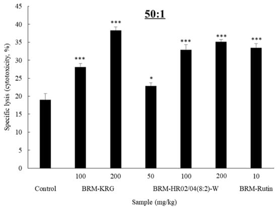 NK cells are known to have remarkable abilities to eliminate cancer cells. They comprise 5–10% of the lymphocytes in the blood and are reported to have natural immune function that directly destroys viruses or infected cells without prior detection of specific antigens [34]. Moreover, since NK cells are lymphocytes that secrete cytokines and also contribute to adaptive immunity by stimulating Tc cell response, they have been observed to play an important role in the immune response mechanisms [35]. Data indicating the cytotoxicity capability of NK cells is shown in Figure 3. When mice were administered with HR02/04(8:2)-W at 50 mg/kg, 100 mg/kg, and 200 mg/kg, NK cell-induced cytotoxicity was found to be 22.87%, 32.82%, and 35.15%, respectively. On comparing the cytotoxicity in the experimental group with 19.01% cytotoxicity in the control group, it was confirmed that the probability of apoptosis was significantly increased in the HR02/04(8:2)-W-treated group. The KRG-treated group was used as a positive control, which was found to be 28.07% and 38.26% cytotoxic at concentrations of 100 mg/kg and 200 mg/kg, respectively. Thus, HR02/04(8:2)-W was considered to have the ability to enhance immunity by increasing the activity of NK cells to a level similar to that of the KRG-treated group. Furthermore, on treatment with rutin, which is a biologically active component of the HR02/04, we found high NK cell cytotoxicity. As a result of the experiment, it was confirmed that HR02/04(8:2)-W effectively increased NK cytotoxicity and the superior immune-enhancing effect of HR02/04(8:2)-W might be due to the interaction between rutin and complex components [9].