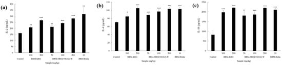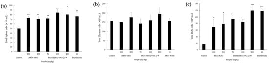 Data indicating the expression of IL-1β, IL-6, and TNF-α, which are the key factors of the immune response, are shown in Figure 2. Results confirmed that IL-1β expression levels (Figure 2a) were significantly upregulated in all experimental groups compared to the control group. When HR1902 and HR1904 were treated alone, the maximum was measured at 223.4 pg/mL and 215.6 pg/mL, respectively. However, the mixed extract of the two showed a synergetic effect, which increased the expression of IL-1β very effectively up to 655.8 pg/mL in HR02/04(8:2)-W. Moreover, it was found that IL-1β expression levels were significantly more upregulated in HR02/04(8:2)-W than the KRG-treated group (about 97.1 pg/mL at 100 μg/mL and approximately 122.3 pg/mL at 1000 μg/mL). When cells were treated with samples at 1000 μg/mL, the IL-6 expression level was observed to be significantly increased compared to the control group (Figure 2b). When HR1902 and HR1904 were treated alone, they were measured to be 497.2 pg/mL and 465.3 pg/mL, respectively. However, the mixed extract of the two was measured at a maximum of 1721.3 pg/mL, showing a strong synergetic effect, and increased the expression level of IL-6 by three times or more than a single extract. Additionally, it showed an increase of about 231.5 pg/mL compared to that observed in the KRG-treated group and effectively enhanced the expression level of IL-6 in macrophages. Further analysis showed that when cells were treated with HR1902-W, HR02/04(2:8)-W, and HR02/04(5:5)-W (each at 1000 μg/mL), TNF-α expression levels were found to be 726.9 pg/mL, 681.4 pg/mL, and 702.2 pg/mL, respectively, which was similar to that observed in the KRG-treated group (757.1 pg/mL). Experimental groups that were treated with HR02/04(8:2)-W extracts at concentrations of 100 μg/mL and 1000 μg/mL were found to have more than 1.5-fold upregulation in the TNF-α expression level than those in the KRG-treated group. Thereby, this mixing ratio was found to effectively improve the immune response in macrophages. Furthermore, experiments showed that hot water extracts tended to stimulate immune-related biomarkers more effectively than ethanol extracts. Consistent with the highest NO expression exhibited by HR02/04(8:2)-W-treated cells, cytokine expressions were also found to have the most significant upregulation on HR02/04(8:2)-W treatment. Consequently, hot water extract (8:2) of HR1902 and HR1904 was considered to have the most immune-enhancing efficacy and thus, was used for further in vivo experiments.