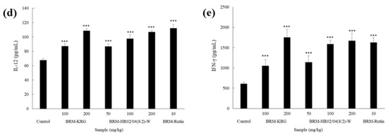 IL-2 is a cytokine that mediates and regulates adaptive immunity. It is secreted during T lymphocyte activation, which has been reported to stimulate the proliferation and differentiation of T lymphocytes, B lymphocytes, and NK cells [37]. Furthermore, IL-6 has been shown to play a significant role in stimulation of the innate and acquired immune responses by mediating short-range interaction between target cells and T cells, thereby contributing to activation of B lymphocytes and promotion of IgE production [38]. Similarly, IL-10 is a cytokine that regulates innate as well as acquired immunity and has been reported to be expressed by activated macrophages and T lymphocytes. Prior studies have suggested the possibility of a direct role of IL-10 in growth, differentiation, activation, and function of T cells and thymocytes [39,40]. IL-12 mediates innate immunity by promoting Th1 cells and plays an important role in initiating the immune response of macrophages, NK cells, and T lymphocytes. Studies suggest that IL-12 is usually produced in macrophages and dendritic cells [41]. On the other hand, IFN-γ is one of the lymphokines that is involved in the generation of Tc cells from resting precursor cells. IFN-γ has been shown to be produced by activated T cells and NK cells. Additionally, prior studies have suggested that IFN-γ enhances the release of IL-1, a lymphokine that acts as an accessory signal in T cell activation [42,43]. As shown in Figure 4, all types of evaluated cytokines were significantly upregulated on treatment with HR02/04(8:2)-W (p < 0.05). Moreover, since expression of all cytokines, except IL-10, was observed to elevate to a level equal to or higher than that expressed by the KRG-treated group, it was believed that the immune response could be effectively mediated.