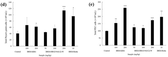 To evaluate the effect of HR02/04(8:2)-W on the immune system, we extracted tissues from major immune organs of mice (spleen, thymus, DLN, Peyer’s patches, and PEC) and measured the total cell number. The spleen is responsible for the key protective immune response against antigens and is known to be the main lymphoid organ where B and T lymphocytes differentiate. Thus, the growth of the spleen cells is considered to be of utmost significance in the immune system [44]. The thymus is one of the central lymphoid organs and has been shown to play an important role in cellular immunity by producing mature T lymphocytes from immature T lymphocytes [45]. Furthermore, Peyer’s patches are considered to be a lymphoid tissue, which induces mucosal immune responses such as local IgA production and systemic immune responses [46]. Lymph nodes are situated partially along the lymphatic vessels and act as a filter station to prevent transmission of pathogens into the body. These have been shown to be the main sites of the innate immune response, which later also mediate an adaptive immune response [47]. Our data analysis showed that compared to the control group, the total number of cells in the HR02/04(8:2)-W-treated group was significantly augmented in all tissues except the thymus (Figure 6). On comparing the effect of KRG and HR02/04(8:2)-W treatment in DLN at concentrations of 100 mg/kg and 200 mg/kg, we found that the KRG-treated group had 68.6 × 104 cells/mL and 78.0 × 104 cells/mL, respectively, while the HR02/04(8:2)-W-treated group had 84.0 × 104 cells/mL and 119.5 × 104 cells/mL, respectively. Thus, it was confirmed that the HR02/04(8:2)-W-treated group significantly increased the number of DLN cells compared to those in the KRG-treated group. In Peyer’s patches, the 200 mg/kg KRG-treated group was found to have 62.0 × 104 cells/mL and the HR02/04(8:2)-W-treated group at the same concentration was observed to have 114.0 × 104 cells/mL. Thus, results suggested that HR02/04(8:2)-W treatment significantly and effectively increased the total cell number in Peyer’s patches by more than 83% compared to that in the KRG-treated group.