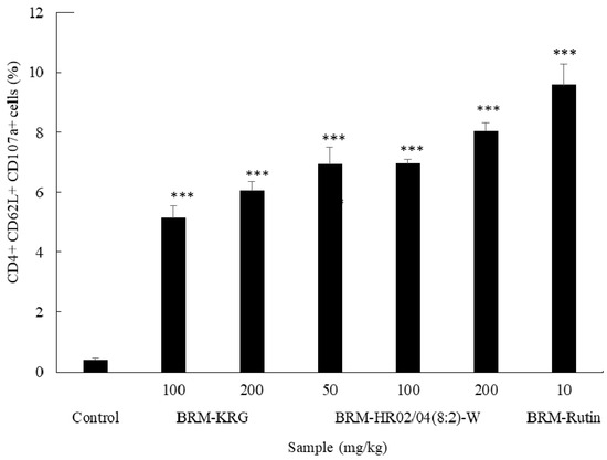 Functional activity of NK cells using CD107a (LAMP-1) as a marker is shown in Figure 7. CD62L is a cell surface marker that has been shown to be expressed by NK cells since its origination and has been found to gradually increase its expression in a time-dependent manner [52]. CD107a (LAMP-1) has been reported as a marker for degranulation of NK and activated CD8+ T cells [53]. CD4+/CD62L+/CD107a+ NK cells were analyzed to investigate the activity of NK cells in the spleen. Our analysis showed that CD107a expression level in NK cells was significantly weak in the control group; however, we found a prompt increase following HR02/04(8:2)-W treatment. Moreover, the level of NK cell activation was found to be significant in the HR02/04(8:2)-W-treated group compared to that in the KRG-treated group (positive control).
