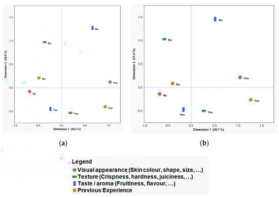 Multiple correspondence analysis (MCA) of retail market (a) and special-event market (b) data showing the two-dimensional plot (dimension 1 versus dimension 2), created using the four most important reasons for purchasing apples (visual appearance, texture, taste/aroma, and previous experience), as identified by consumers. Each reason was a binary variable with a yes/no response.